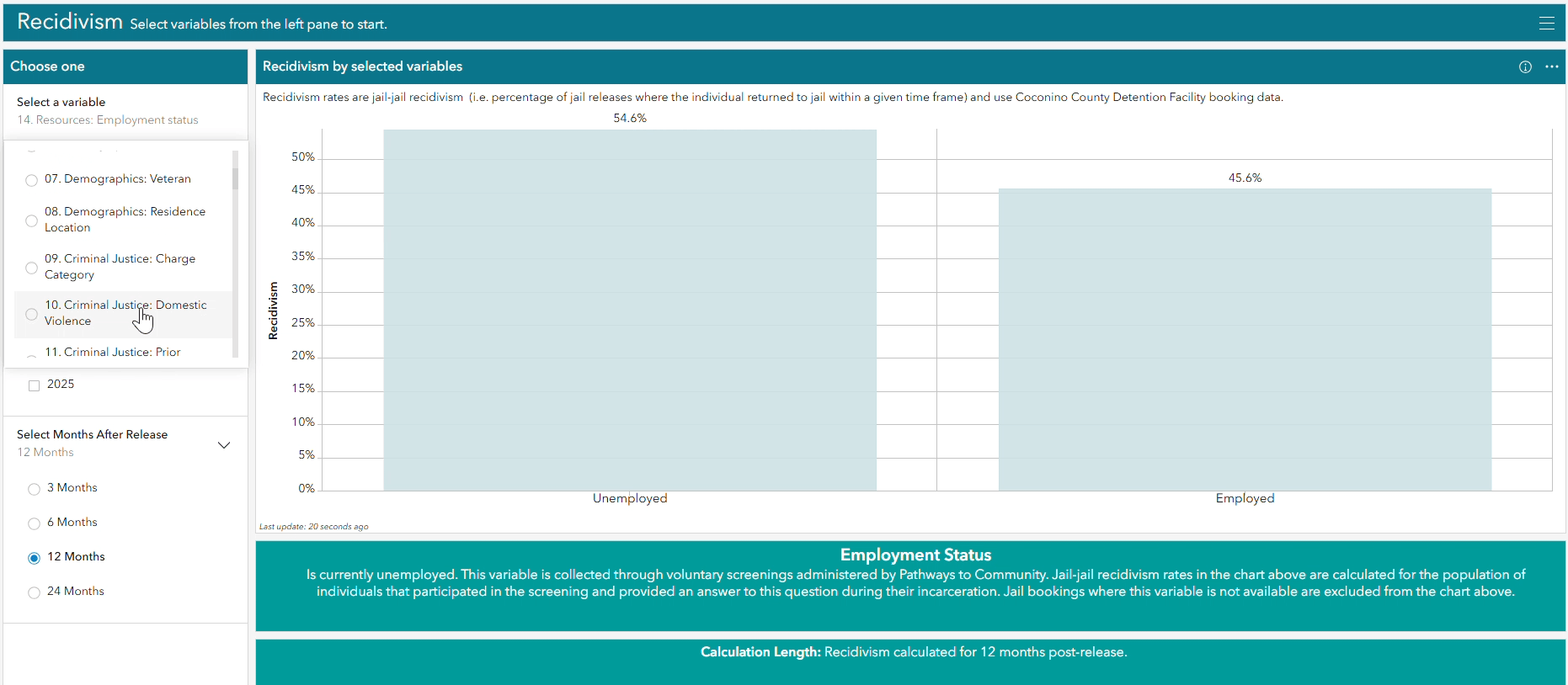 A dashboard that visualizes the relationship between recidivism and other variables including risk factors.